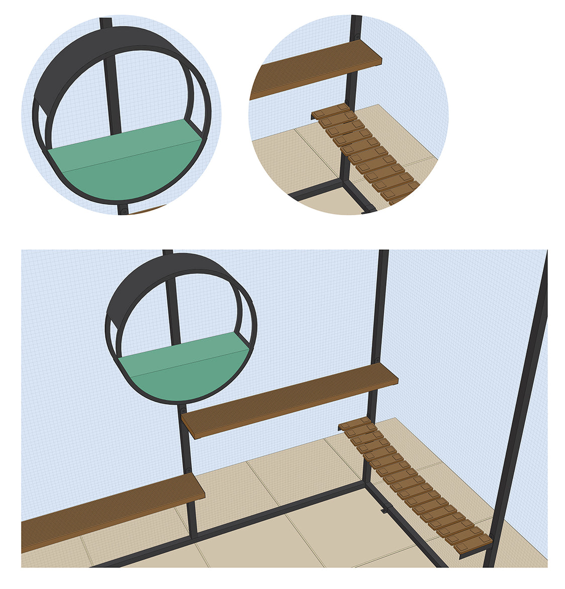 Das Hinzufügen von Beschäftigungs- und Kletterelementen ist eine großartige Möglichkeit, den vertikalen Raum Ihres Catios optimal zu nutzen – so kann Ihre Katze springen, klettern, laufen oder einfach entspannen.