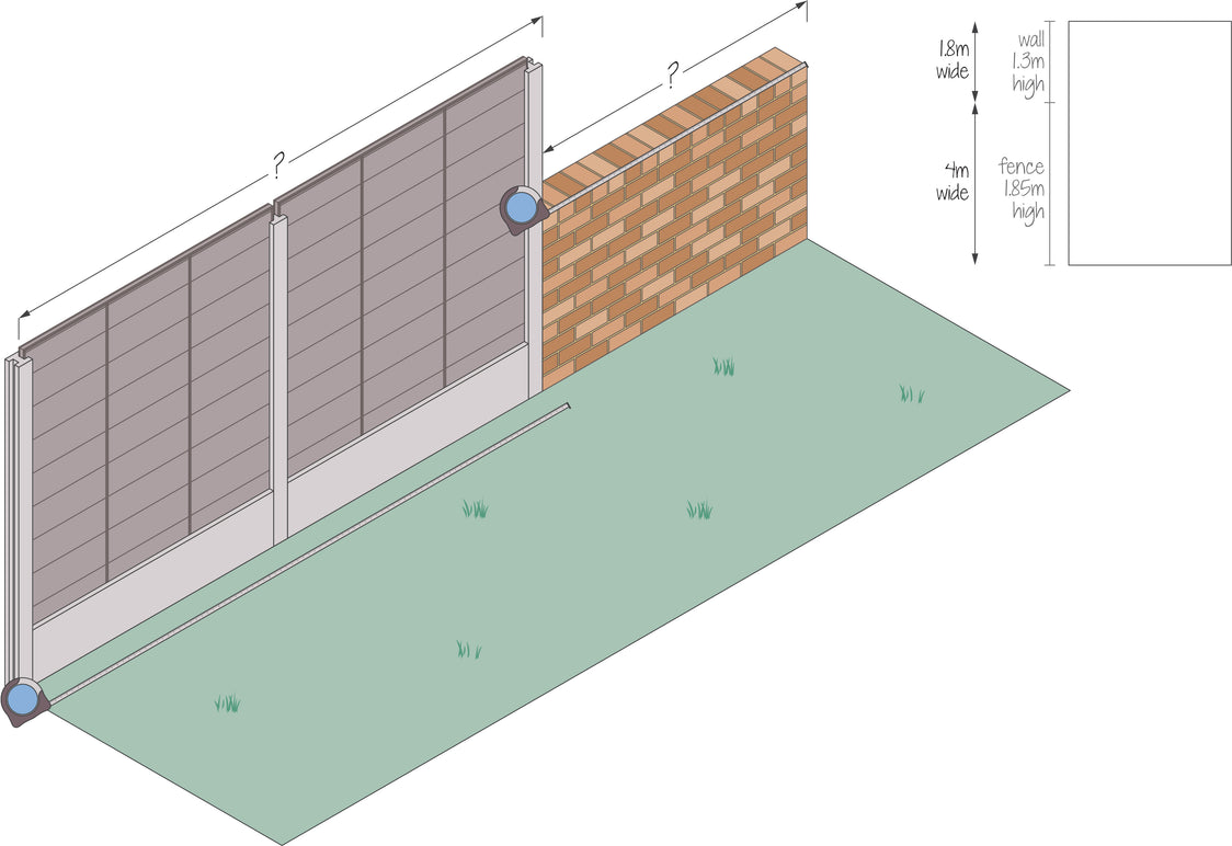 Jede bestehende Einfriedung mit unterschiedlicher Höhe muss separat in der Länge gemessen werden. Wenn Ihr Zaun zum Beispiel gerade verläuft, aber sich die Höhe mittig von 1,8 m auf 1,6 m ändert, messen Sie bitte beide Abschnitte getrennt.