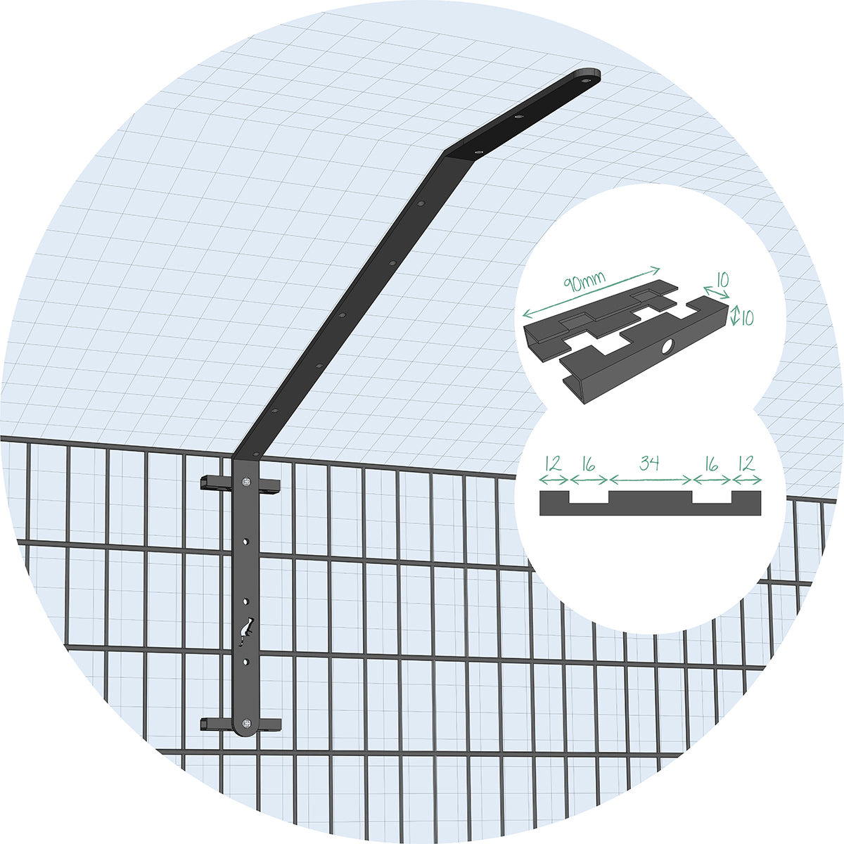 Internal measurements: 12mm, 16mm, 34mm, 16mm, 12mm - fits most mesh fences.